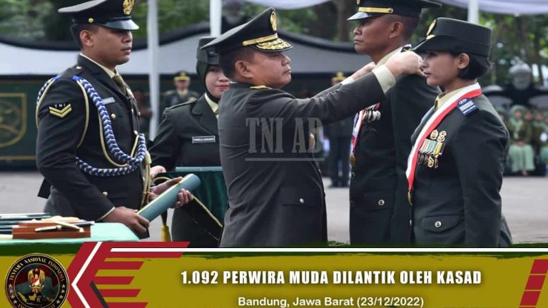 CAKRA101, Bandung- Kepala Staf Angkatan Darat (Kasad) Jenderal TNI Dr.Dudung Abdurachman melantik 1.092 Perwira Muda abituren Pendidikan Pembentukan Perwira (Diktukpa) TNI AD Program Diploma-3 (Ahli Madya) Gelombang II TA 2022 di Bumi Panorama Sekolah Calon Perwira Angkatan Darat (Secapaad) Bandung, Jumat (23/12/2022).