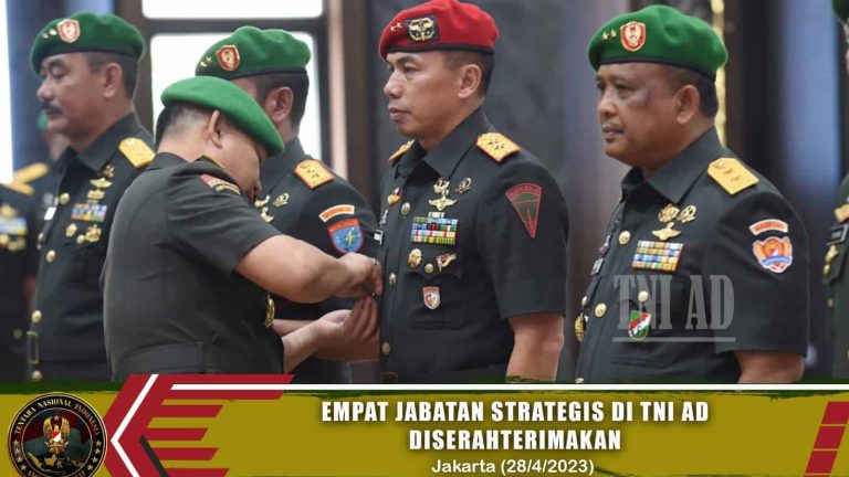 CAKRA101, Jakarta- Kepala Staf Angkatan Darat (Kasad) Jenderal TNI Dr. Dudung Abdurachman memimpin Serah Terima Jabatan (Sertijab) Empat Jabatan strategis di lingkungan TNI Angkatan Darat yang digelar di Aula A.H Nasution, Markas Besar Angkatan Darat (Mebesad), Jakarta, Jumat (28/4/2023)