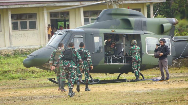 “Selanjutnya Letkol Inf Dimas Yamma Putra Dansatgas Yonif 623/BWU dan Letkol Inf Andika Ganesakti Dansatgas 133/YS menaiki Helly Bell Type Pesawat Beli- 412 EP TNI AD No Reg HA-5155 bersama rombongan mengudara menuju Kampung Fuog Distrik Aifat Selatan dan Kampung Ayata Distrik Aifat Timur Tengah,” terang Pakum.
