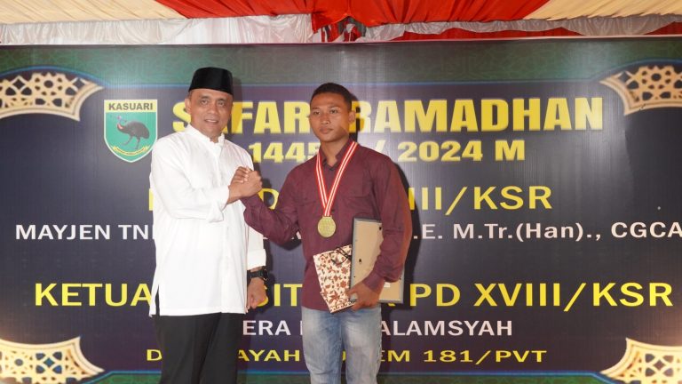 Cakra101, Manokwari.- Dalam moment Safari Ramadan Pangdam XVIII/Kasuari, Mayjen TNI Ilyas Alamsyah, S.E., M.Tr.(Han)., CGCAE., di wilayah Papua Barat Daya, memberikan penghargaan yang diberikan kepada prajurit Kodam XVIII/Kasuari, di Makorem 181/PVT, Sorong, pada Minggu (24/3/2024).