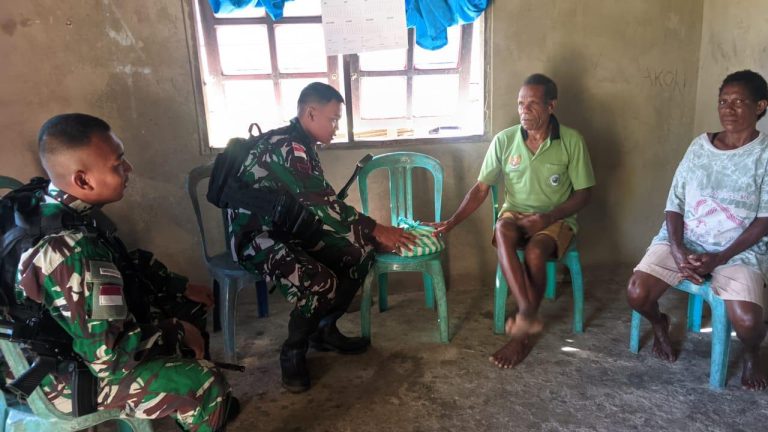 Cakra101, Maybrat.- Satgas Pamtas Kewilayahan Yonif 623/BWU Pos Konja, melaksanakan anjangsana dan memberikan bantuan sembako di Kampung Konja, Distrik Aifat Utara, Kabupaten Maybrat, Papua Barat Daya, Rabu (27/03/2024).