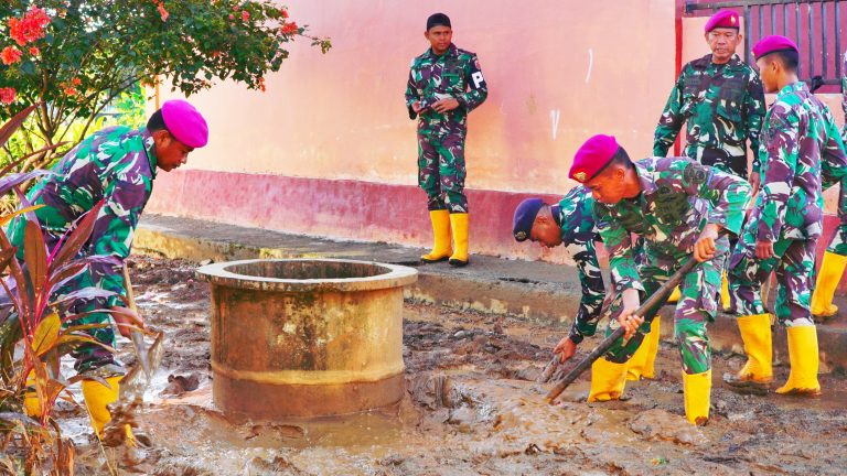 Cakra101, Luwu.- Prajurit Korps Marinir yang tergabung dalam Satuan Tugas Penanggulangan Bencana Lantamal VI Makassar membersihkan Fasilitas umum seperti sekolah dan Masjid akibat bencana alam banjir dan tanah longsong di Kabupaten Luwu. Sabtu (11/05/2024).