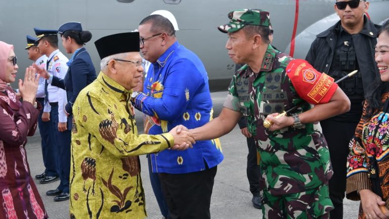 Cakra101, Sorong.- Papua Barat Daya, Pangdam XVIII/Kasuari Mayjen TNI Hariyanto, S.I.P., M.Tr. (Han) didampingi Ny. Rina Haryanto menyambut kedatangan Wakil Presiden RI Prof. Dr. (H.C) K.H. Ma’ruf Amin beserta Ibu HJ. Wury Ma’ruf Amin dan Rombongan di Bandara Bandara DEO, Minggu (5/6/2024).