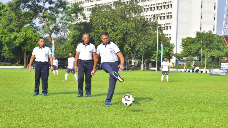 Cakra101, Jakarta.- Wakil Komandan Korps Marinir (Wadan Kormar) Brigadir Jenderal TNI (Mar) Suherlan menendang bola pertama pertanda pertandingan sepakbola antara kesebelasan Korps Marinir (Kormar) melawan kesebelasan Sekolah Staff dan Komando TNI Angkatan Laut (Seskoal) di mulai bertempat di Lapangan sepak bola Trisila Mabesal Cilangkap Jakarta, Rabu (19/06/2024).