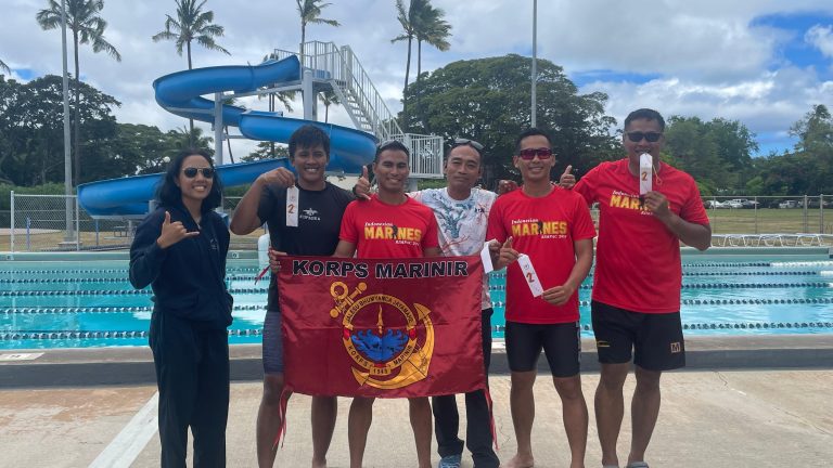 Cakra101, Hawaii.- Tim Renang TNI AL yang terdiri dari Prajurit Petarung Korps Marinir TNI AL, Prajurit KRI Raden Eddy Martadinata-331 dan Prajurit Kopaska yang tergabung dalam Satgas Latma Multilateral Rim of The Pacific (Rimpac) 2024, kembali mengharumkan nama Indonesia dengan meraih juara Ke-2 dalam turnamen Internasional Lomba Renang, bertempat di kolam Renang Scott Pool Pearl Harbour, Hawaii Amerika Serikat, Rabu (03/07/2024).