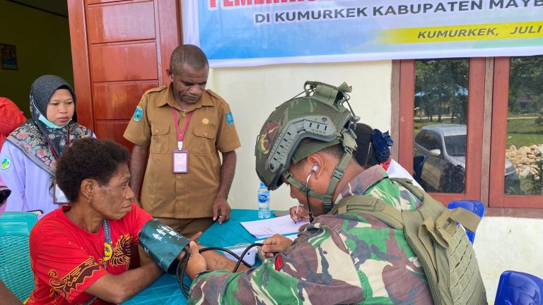 Cakra101, Maybrat.- Dengan digandeng oleh Dharma Wanita Persatuan Kabupaten Maybrat Kabupaten Maybrat, Satgas Pamtas RI-PNG Kewilayahan Papua Barat Daya Yonif 762/VYS Pos Kotis Kumurkek menggelar pengobatan massal secara gratis di Kampng Kumurkek, Distrik Aifat, Kab. Maybrat, Papua Barat Daya. Kamis (18/07/2024).