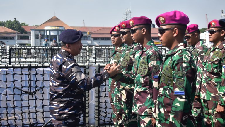 Cakra101, Surabaya.- Prajurit Korps Marinir TNI Angkatan Laut yang tergabung dalam Satgas Multilateral Rim of The Pacific (Rimpac) 2024, ikuti penyambutan kedatangan KRI Raden Eddy Martadinata-331 yang telah kembali ke Indonesia berlayar melewati Samudra Pasifik selesai melaksanakan Latma Multilateral Rimpac 2024 Hawaii.