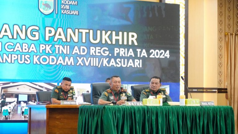 Cakra101, Manokwari.- Panglima Komando Daerah Militer (Pangdam) XVIII/Kasuari, Mayjen TNI Haryanto, S.I.P., M.Tr.(Han)., memimpin sidang penentuan akhir (Pantukhir) kepada 110 Calon Bintara Prajurit Karier (Caba PK) TNI AD Sub Panpus Kodam XVIII/Kasuari yang sebelumnya telah mengikuti berbagai tahapan seleksi hingga tahap sidang pemilihan, berlangsung di Aula Makodam, Trikora, Arfai 1, Manokwari, Papua Barat, pada Rabu (4/9/2024).