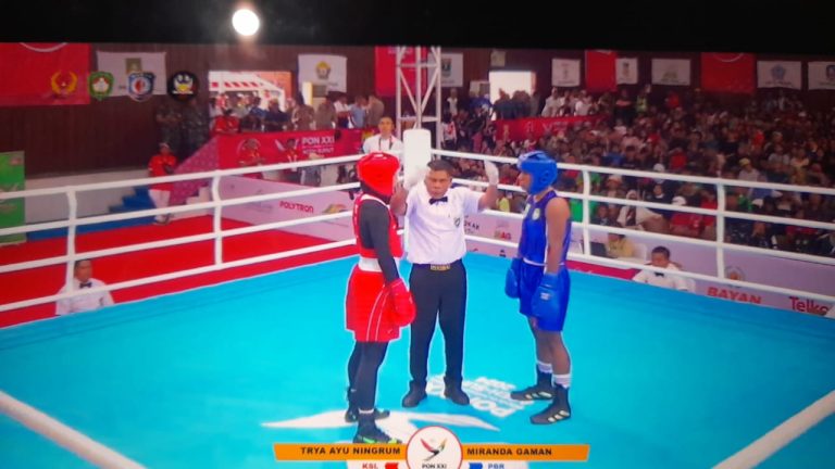 Cakra101, Aceh.- Pertandingan sengit di arena tinju PON XXI Aceh-Sumut 2024 memperlihatkan kehebatan petinju asal Papua Barat, Miranda Leonora A Gaman, pada hari ke lima perhelatan kegiatan ini berhasil meraih kemenangan telak 5-0 melawan lawannya asal Kalimantan Selatan (Kalsel). Dalam laga kelas 66-70 Kg Elite Women , Miranda menunjukkan kemampuan bertarung luar biasa, mendominasi jalannya pertandingan sejak awal, pada Sabtu (14/9/2024).