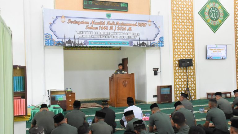 Hal ini disampaikan Pangdam XVIII/Kasuari, Mayjen TNI Haryanto, S.I.P., M.Tr.(Han)., dalam sambutannya saat menghadiri peringatan Maulid Nabi Muhammad Shalallahu ‘Alaihi Wasallam 1446 Hijriah/2024 Masehi, di Masjid Istiqlal Kodam XVIII/Kasuari, Trikora, Arfai 1, Manokwari, Papua Barat, pada Kamis (19/9/2024).