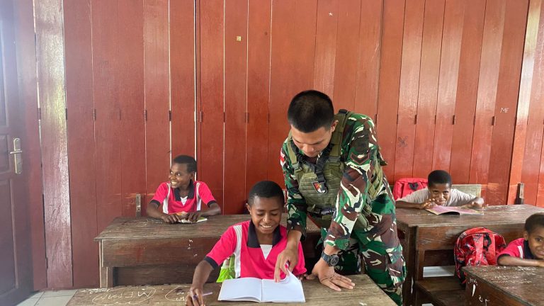 Cakra101, Maybrat.- Tanamkan nilai-nilai Pancasila kepada anak-anak di wilayah penugasan, Satgas Pamtas RI-PNG Kewilayahan Papua Barat Daya Yonif 762/VYS Pos Kokas memberikan wawasan kebangsaan kepada siswa-siswi SD YPPK Efata Kocuwer, Kampung Kokas, Distrik Aifat, Kab.Maybrat. Sabtu (21/09).