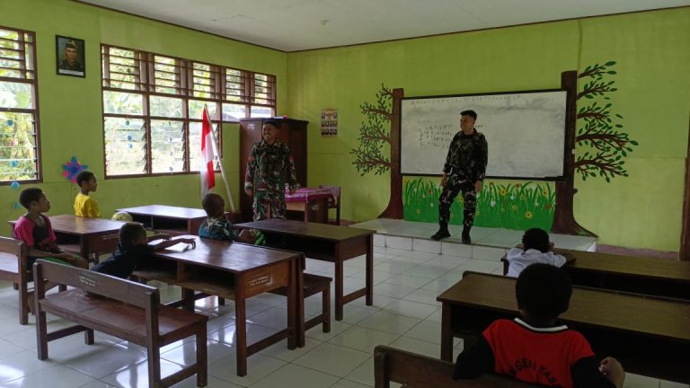 Cakra101, Teluk Wondama.- Pos Naikere Satgas Pamtas RI-PNG Kewilayan Papua Barat Yonif 642 menyalurkan ilmu pengetahuan dan wawasan kepada murid SDN Yabore, Kabupaten Teluk Wondama, Provinsi Papua Barat (08/10/2024).