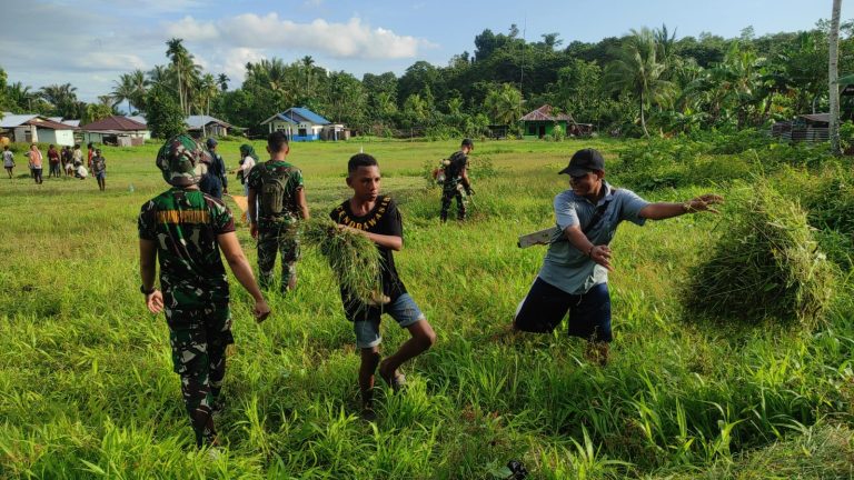 Cakra101, Kaimana.- Dalam rangka menunjang kegiatan kemah Pramuka Perjumsami sekaligus memperingati Hari Sumpah Pemuda, Satgas Pamtas Kewilayahan Yonif 642/Kps Pos Teluk Arguni melaksanakan karya bakti bersama masyarakat membersihkan Lapangan Besar Wanggita di Kampung Wanggita, Distrik Teluk Arguni, Kaimana (24/10/2024).