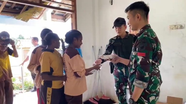 Cakra101, Teluk Bintuni.- Pembinaan teritorial terus dilakukan oleh Satgas Pamtas Kewilayahan RI-PNG Yonif 642/Kps, melalui Pos Jagiro. Pembagian makan gratis untuk siswa siswi SDN Kampung Jagiro, Distrik Moskona Selatan, Kabupaten Teluk Bintuni, Provinsi Papua Barat, Senin (18/11/2024).