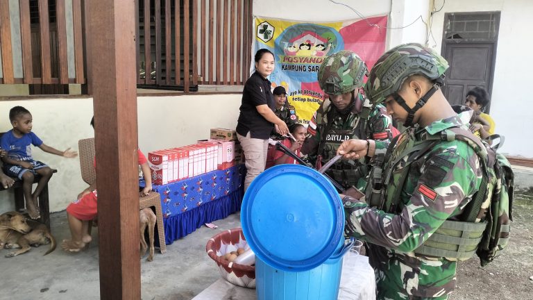 Cakra101, Teluk Wondama.- Pos Naikere Satgas Pamtas RI-PNG Kewilayan Papua Barat Yonif 642/kps membagikan bubur kacang ijo dan bantuan kesehatan di desa Sararti Kabupaten Teluk Wondama, Provinsi Papua Barat, Jumat, (22/11/2024).