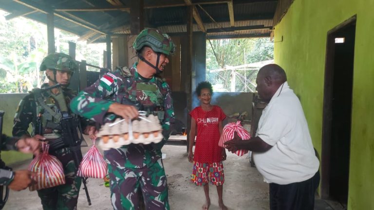 Cakra101, Mansel.- Pos Kout Tahota Satgas Pamtas RI-PNG Yonif 642/Kps Wilayah Papua Barat yang dipimpin langsung oleh Danpos Lettu inf Supiyan melaksanakan kegiatan berbagi sembako kepada masyarakat guna membantu masyarakat sekitar distrik Tahota. (Senin, 06/01/2025)