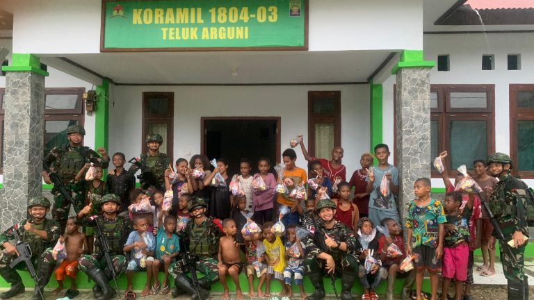 Cakra101, Kaimana.- Dengan sangat antusias Pos Teluk Arguni Satgaa Yonif 642/Kps bagikan snack kepada anak-anak di Distrik Teluk Arguni, Kampung Wanggita, Kabupaten Kaimana. Kamis (9/1/2025).