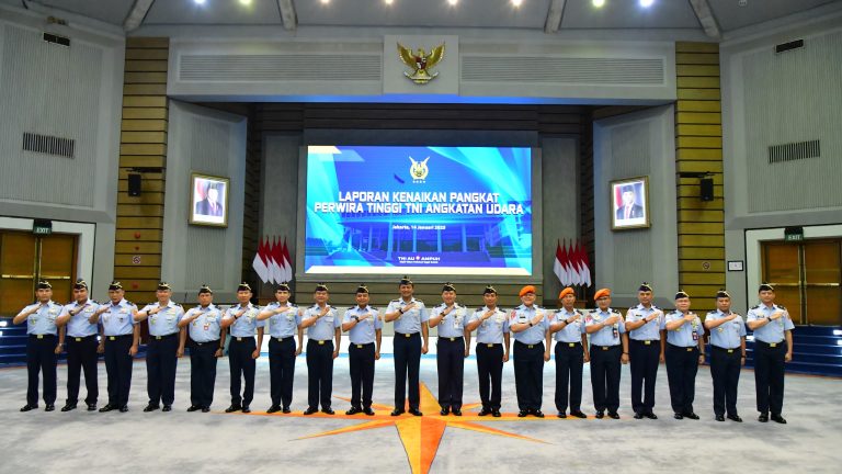 Cakra101, Jakarta.- Kepala Staf Angkatan Udara (Kasau), Marsekal TNI M. Tonny Harjono, S.E., M.M., didampingi Ketua Umum Pia Ardhya Garini, Ny. Isa M. Tonny Harjono, menerima laporan kenaikan pangkat 17 Perwira Tinggi (Pati) TNI Angkatan Udara di Gedung Auditorium I.G Dewanto, Mabesau, Cilangkap, Jakarta, Senin (14/1/2025).