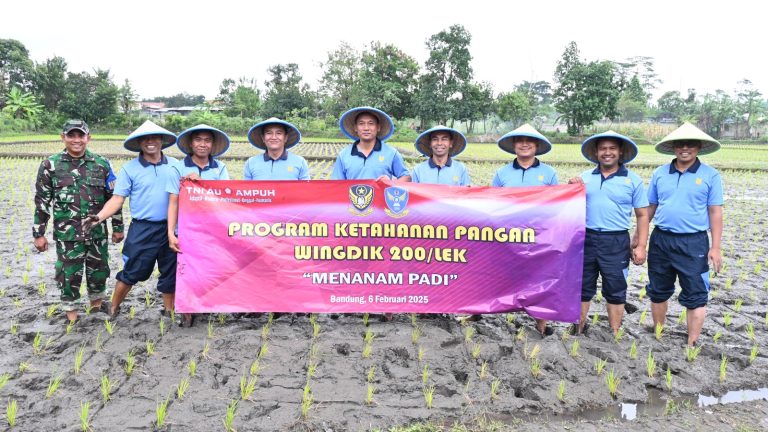 Cakra101, Margahayu.- Dalam rangka mendukung program ketahanan pangan pemerintah serta optimalisasi lahan produktif di lingkungan TNI AU, Komandan Wing Pendidikan 200/Lek (Danwingdik 200/Lek) Kolonel Kek Supriyadi, S.Kom., M.Han., bersama para Komandan Skadron Pendidikan (Danskadik) melaksanakan penanaman padi varietas unggul di lahan seluas 5.000 m² di depan Kantor Dispotdirga Lanud Sulaiman, Margahayu, Kabupaten Bandung, Kamis (6/2/2025).