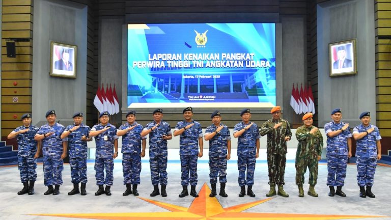 Cakra101, Cilankap.- Kepala Staf Angkatan Udara (Kasau) Marsekal TNI M. Tonny Harjono, S.E., M.M. menerima laporan kenaikan pangkat (Kenkat) 12 Perwira Tinggi (Pati) TNI Angkatan Udara, di Gedung Auditorium I.G Dewanto Mabesau, Cilangkap, Jakarta Timur, Senin (17/2/2025)