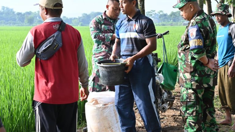 Tampak personel Babinpotdirga Lanud SKI mengadakan koordinasi dengan para petani binaan dan melaksanakan pemberian pupuk padi dengan di tebar serta melaksanakan penyemprotan hama padi di persawahan Lanud SKI.