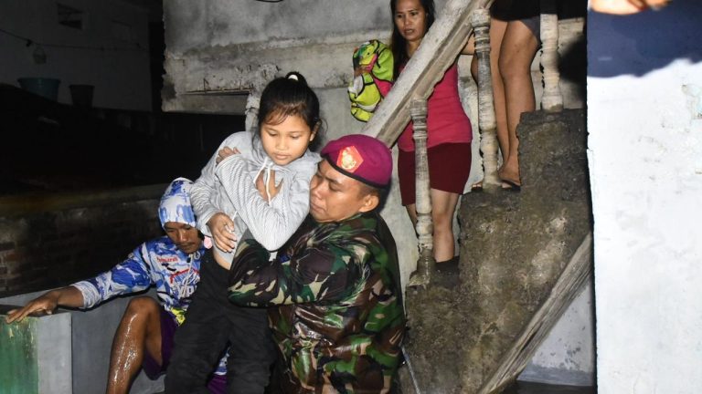 Cakra101, Manado.- Prajurit Petarung Yonmarhanlan VIII Bitung, melaksanakan evakuasi warga korban banjir di Kel. Ternate Tanjung Kec. Singkil Kota Manado, minggu (23/03/2025)