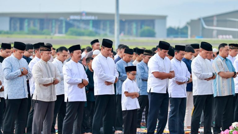 Cakra101, Jakarta.- Kepala Staf Angkatan Udara (Kasau) Marsekal TNI M. Tonny Harjono, S.E., M.M. bersama Ketua Umum PIA Ardhya Garini Ny. Isa M. Tonny Harjono melaksanakan Salat Idulfitri 1 Syawal 1446 Hijriah di Apron Skadron Udara 45, Pangkalan TNI AU Halim Perdanakusuma, Jakarta Timur, Senin (31/3/2025).