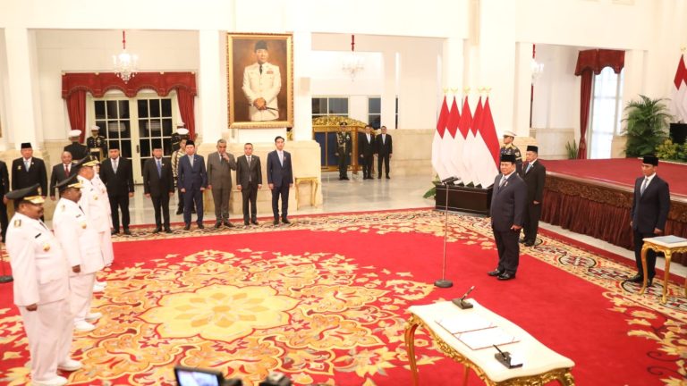 Cakra101, Jakarta.- Menteri Dalam Negeri (Mendagri) Muhammad Tito Karnavian mendampingi Presiden Prabowo Subianto melantik Gubernur dan Wakil Gubernur Kepulauan Bangka Belitung (Babel) Hidayat Arsani dan Hellyana, serta Gubernur dan Wakil Gubernur Papua Pegunungan John Tabo dan Ones Pahabol. Pelantikan berlangsung di Istana Negara, Jakarta, Kamis (17/4/2025).