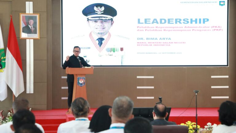 Cakra101, Sumedang.- Wakil Menteri Dalam Negeri (Wamendagri) Bima Arya Sugiarto mendorong lahirnya pemimpin yang berkarakter dan visioner di lingkungan Aparatur Sipil Negara (ASN). Dorongan tersebut ia sampaikan saat memberikan keynote speech pada Pelatihan Kepemimpinan Administrator (PKA) dan Pelatihan Kepemimpinan Pengawas (PKP) di Aula Gunung Gede, Pusat Pengembangan Sumber Daya Manusia (PPSDM) Regional Bandung, Kabupaten Sumedang, Jawa Barat, Senin (22/9/2025).