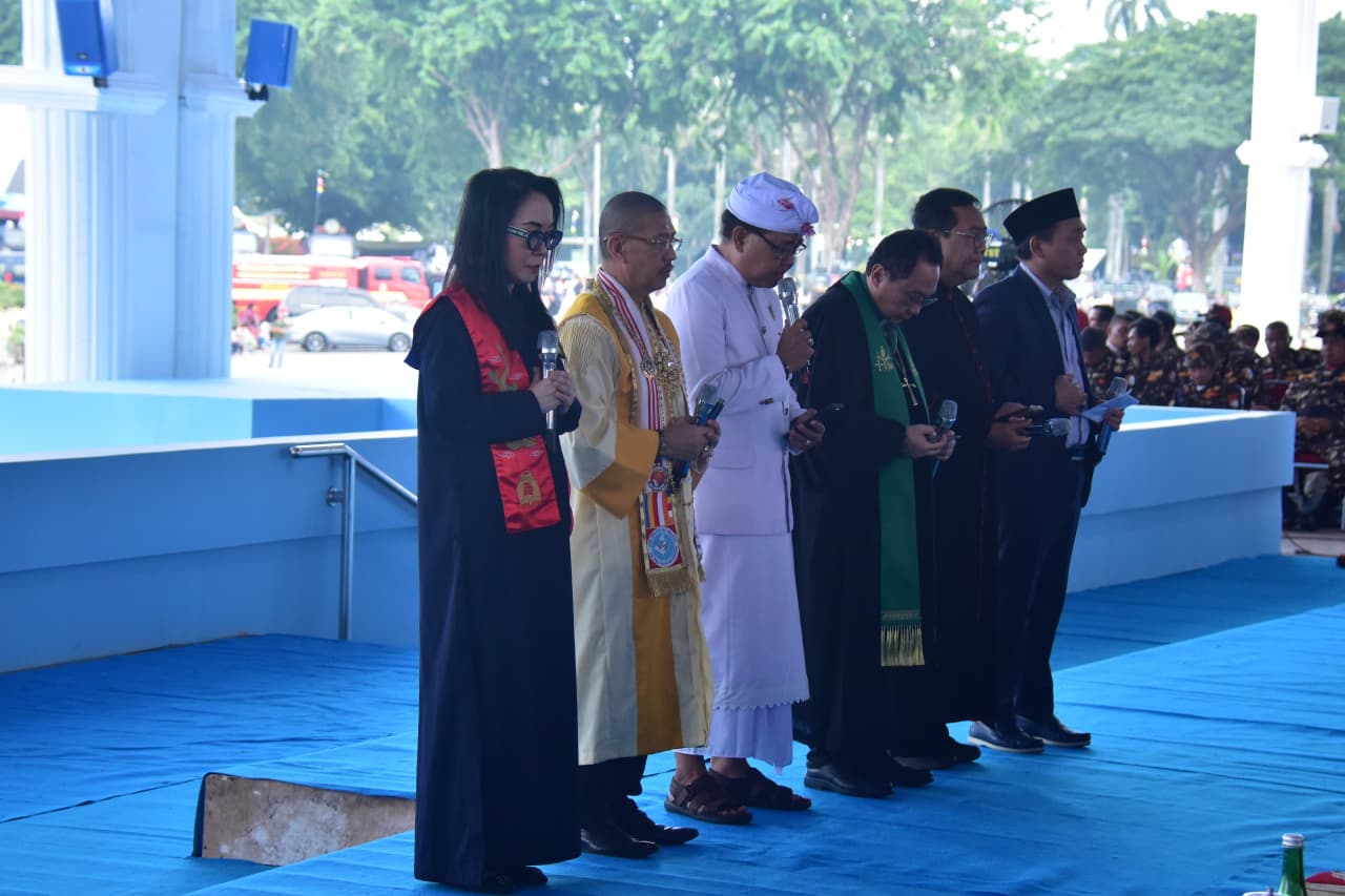 Doa bersama diawali dengan pembacaan ayat suci Al-Qur’an dan diisi dengan doa lintas agama yang dipimpin oleh perwakilan dari berbagai pemuka agama, mencerminkan semangat kebersamaan dan persatuan bangsa.