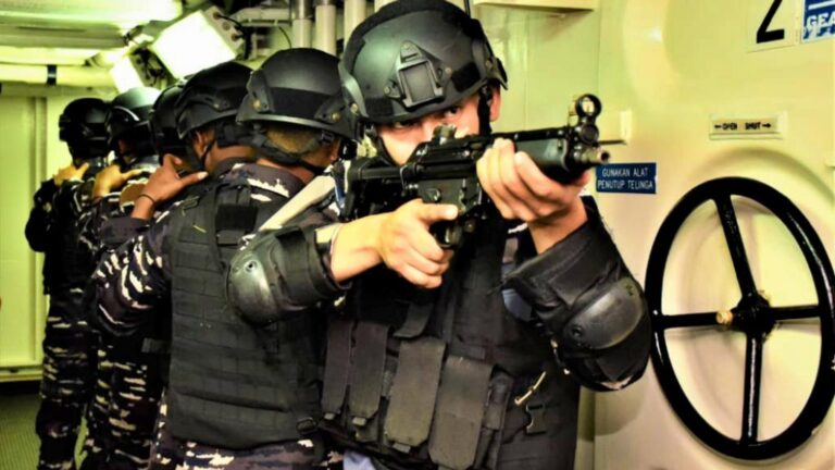 SELAT MALAKA, Cakra101.- Dalam rangka menjaga kesiapsiagaan dan meningkatkan kemampuan prajurit, KRI John Lie-358 melaksanakan latihan Visit, Board, Search, and Seizure (VBSS) di Perairan Selat Malaka, Senin (6/10/2025).