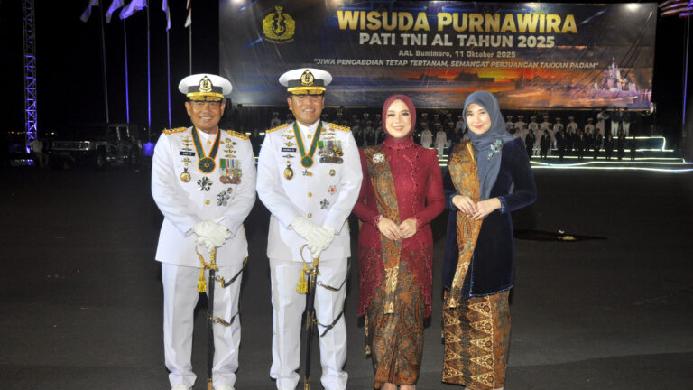 SURABAYA, Cakra101.- Panglima Korps Marinir (Pangkormar) Letnan Jenderal TNI (Mar) Dr. Endi Supardi, S.E., M.M., M.Tr.Opsla., CHRMP., CRMP. Didampingi Ketua Gabungan Jalasenastri Korps Marinir Ny. Nana Endi Supardi menghadiri Upacara Wisuda Purna Wira (WPW) Perwira Tinggi (Pati) TNI AL Tahun 2025, yang digelar di Lapangan Laut Arafuru, Akademi Angkatan Laut (AAL) Bumi Moro, Surabaya, pada Sabtu malam (11/10/2025).