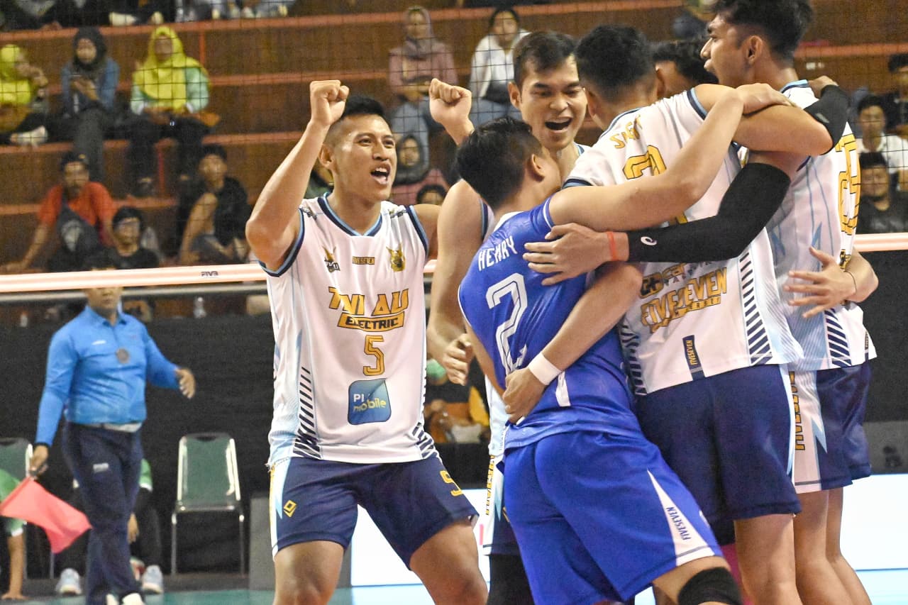 Tim putra TNI AU Electric mencatatkan kemenangan atas Perumda Tirta Bhagasasi Bekasi dengan skor 3-2 (25-20, 21-25, 32-30, 17-25, 15-5).