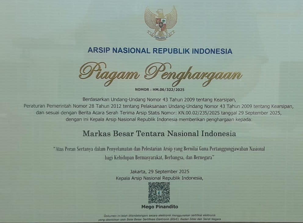 JAKARTA, Cakra101.com – Sekretariat Umum (Setum) TNI menerima Piagam Penghargaan dari Arsip Nasional Republik Indonesia (ANRI) atas kontribusi dan peran aktif dalam penyelamatan serta pelestarian arsip statis Tentara Nasional Indonesia (TNI). Penyerahan penghargaan dilaksanakan di Ruang Noerhadi Magetsari, Kantor ANRI, Cilandak, Jakarta Selatan, pada Senin (26/9/2025).