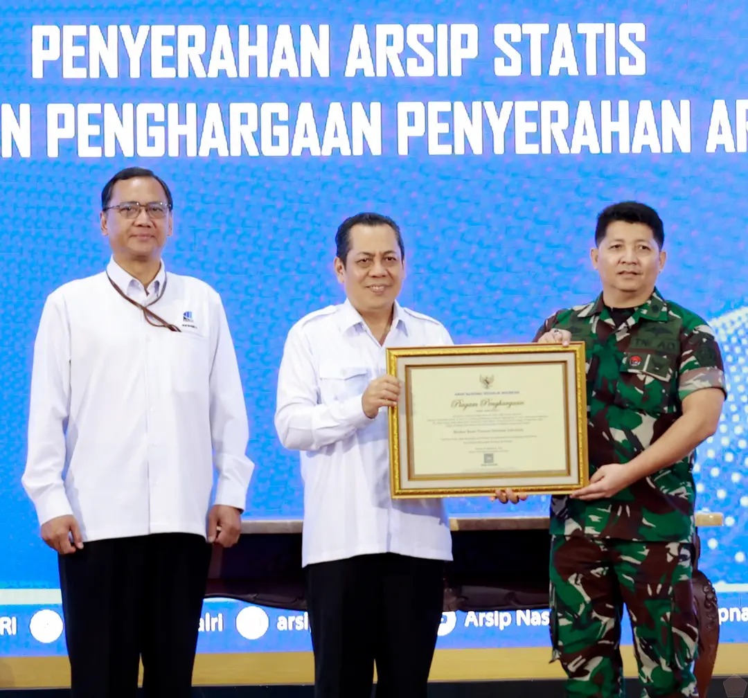 JAKARTA, Cakra101.com – Sekretariat Umum (Setum) TNI menerima Piagam Penghargaan dari Arsip Nasional Republik Indonesia (ANRI) atas kontribusi dan peran aktif dalam penyelamatan serta pelestarian arsip statis Tentara Nasional Indonesia (TNI). Penyerahan penghargaan dilaksanakan di Ruang Noerhadi Magetsari, Kantor ANRI, Cilandak, Jakarta Selatan, pada Senin (26/9/2025).