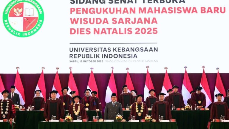 BANDUNG, Cakra101.com – Presiden Prabowo Subianto menyampaikan orasi ilmiah pada Sidang Senat Terbuka dalam rangka Pengukuhan Mahasiswa Baru Sarjana dan Magister Tahun Ajaran 2025/2026, serta Wisuda Sarjana sekaligus Dies Natalis Universitas Kebangsaan Republik Indonesia (UKRI) Tahun 2025. Mengawali orasinya, Presiden memberikan penghargaan atas kepemimpinan Rektor UKRI, Sufmi Dasco Ahmad yang dinilai berhasil mengembangkan universitas secara berkelanjutan.
