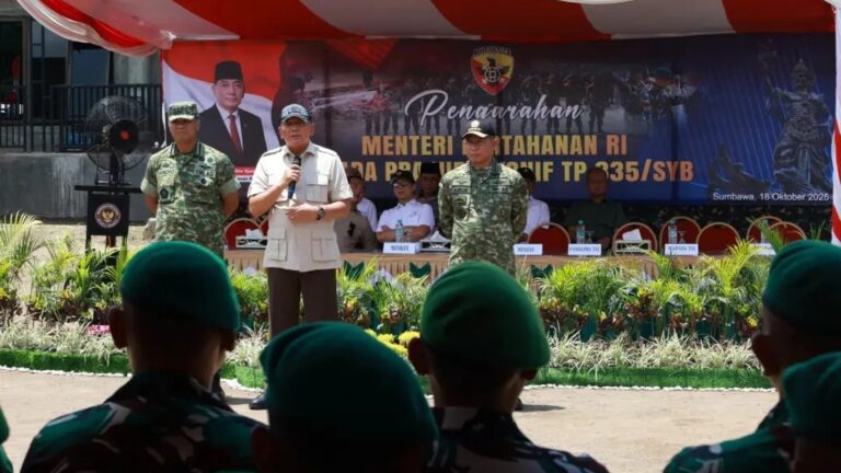 JAKARTA, Cakra101.com – Panglima TNI Jenderal TNI Agus Subiyanto mendampingi Menteri Pertahanan RI Jenderal (Purn) Sjafrie Sjamsoeddin dalam kunjungan kerja ke Markas Sementara Yonif Teritorial Pembangunan (TP) 835/Samota Yudha Bhakti (SYB) di Kabupaten Sumbawa, Nusa Tenggara Barat, Sabtu (18/10/2025). Kunjungan ini bertujuan meninjau kesiapan satuan dalam mendukung pembangunan pertahanan wilayah serta memperkuat konsep pertahanan rakyat semesta yang memberi manfaat langsung bagi masyarakat.
