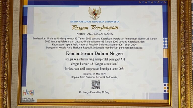 “Penghargaan ini merupakan bentuk pengakuan atas komitmen Kementerian Dalam Negeri dalam pengelolaan arsip yang tertib, profesional, dan sesuai dengan standar nasional,” ujarnya.