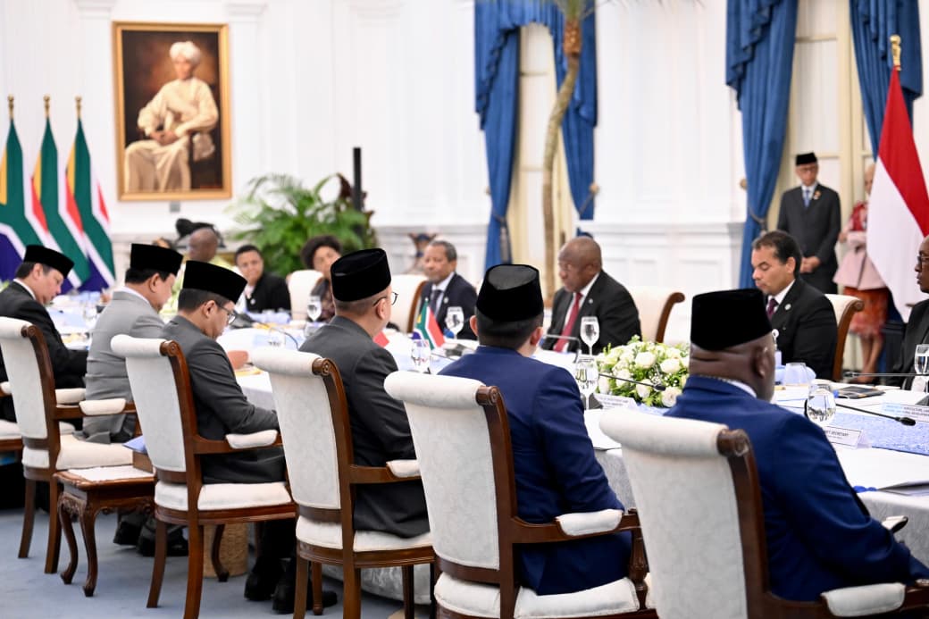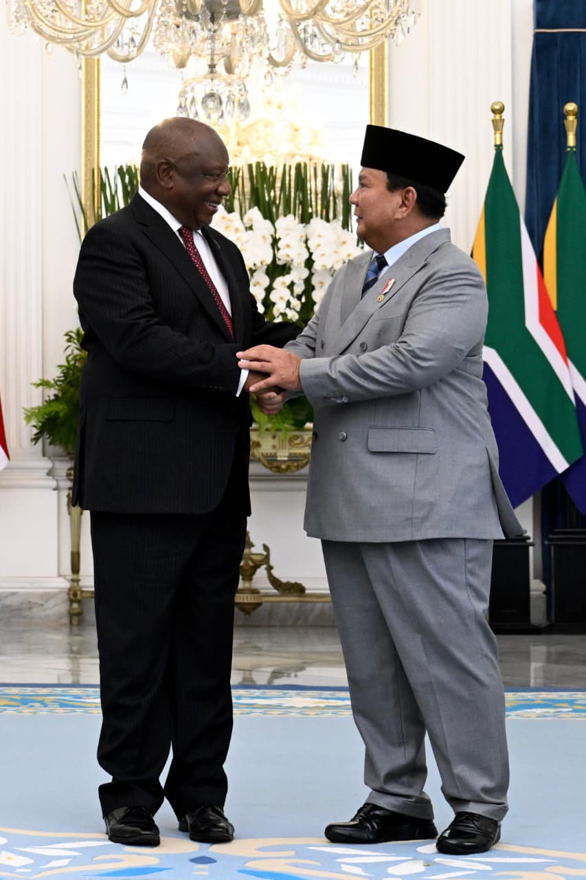 “Merupakan kehormatan besar bagi kami berada di sini hari ini. Kami memandang kunjungan ini sebagai momen yang sangat penting bagi Afrika Selatan di Indonesia. Kami ingin menyampaikan terima kasih atas kehormatan yang diberikan melalui kunjungan kenegaraan tingkat tinggi ini. Kami tidak menganggapnya sebagai hal biasa. Kami melihatnya sebagai bukti nyata pentingnya hubungan antara Afrika Selatan dan Indonesia,” ujar Presiden Ramaphosa.