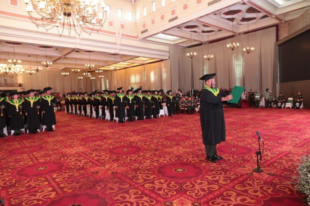 Upacara wisuda dihadiri oleh Guru Besar STHM Jenderal TNI (Purn) Prof. Dr. Dudung Abdurachman, S.E., M.M., Ketua STHM Brigjen TNI R. Delianto Sarwi Diatmiko, S.H., M.H., serta para dosen dan tamu undangan lainnya. Suasana berlangsung khidmat dan penuh kebanggaan, menandai lahirnya generasi baru penegak hukum militer yang siap berkontribusi bagi kemajuan TNI AD dan bangsa.