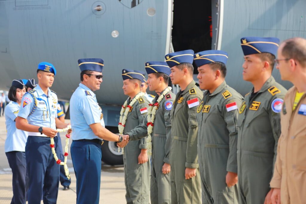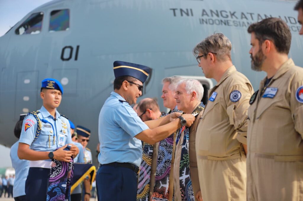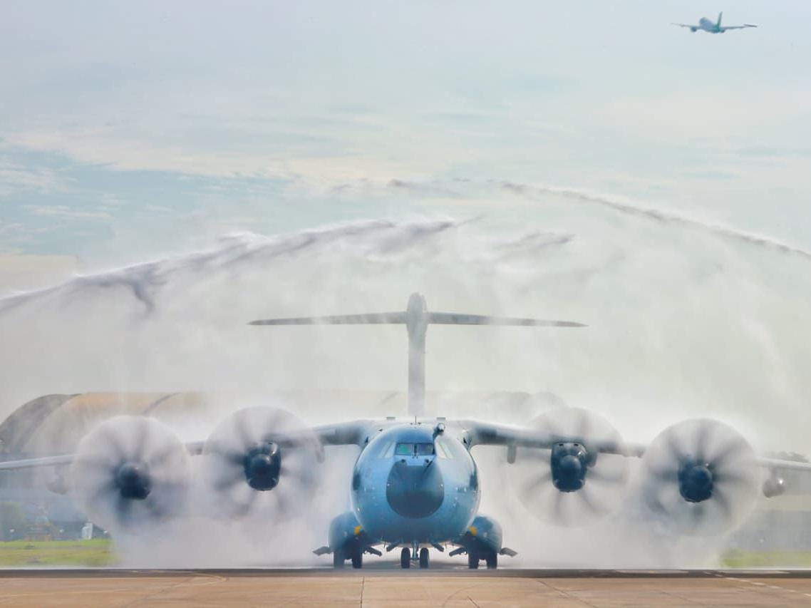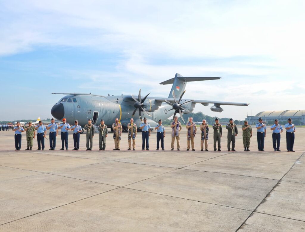 JAKARTA, Cakra101.com – Tradisi water salute menandai kedatangan pesawat Airbus A400M/MRTT pertama Indonesia di Lanud Halim Perdanakusuma, Senin (3/11/2025). Kedatanganya disambut oleh Kasau Marsekal TNI M. Tonny Harjono, S.E., M.M., bersama para pejabat TNI AU.