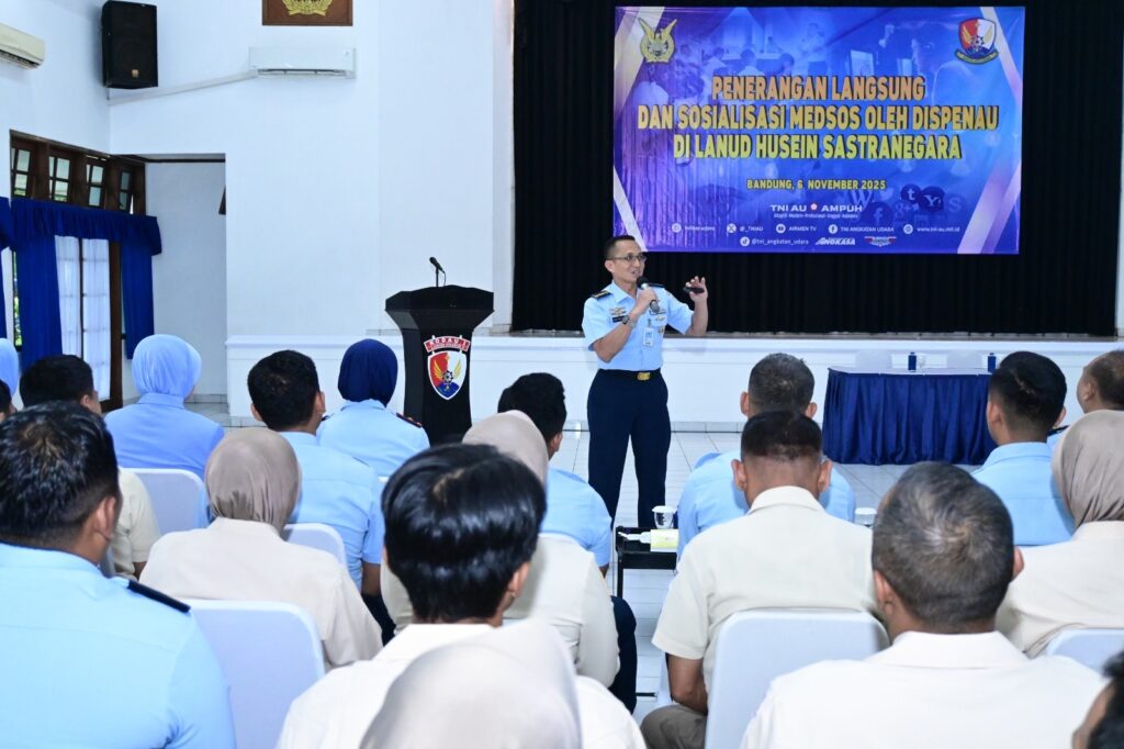 BANDUNG, Cakra101.com – Dinas Penerangan TNI Angkatan Udara (Dispenau) melaksanakan Penerangan Langsung (Pensung) di Gedung Graha Antariksa Lanud Husein Sastranegara, Bandung, Kamis (6/11/2025). Kegiatan ini diikuti oleh personel Lanud Husein Sastranegara, Depohar 10, Lafiau Roostyan Efendi, GPP 2 Pusbekmatau, serta Wingdik 300/Tek.