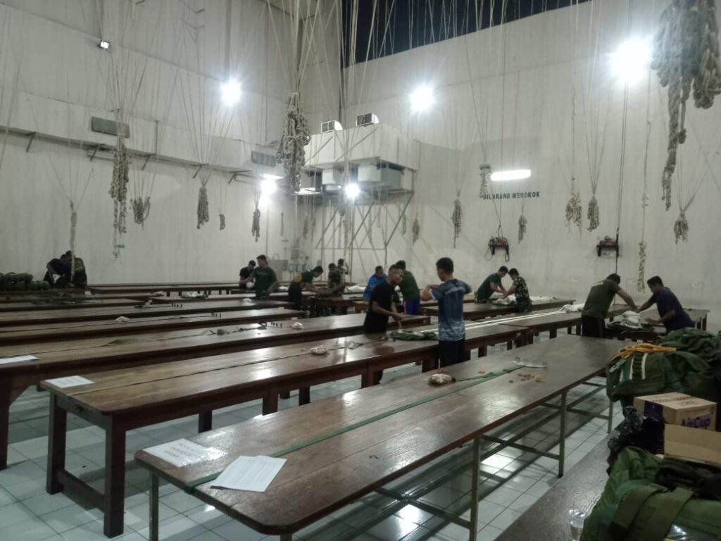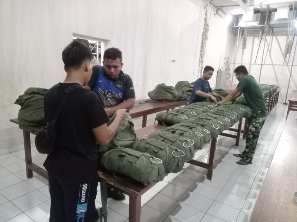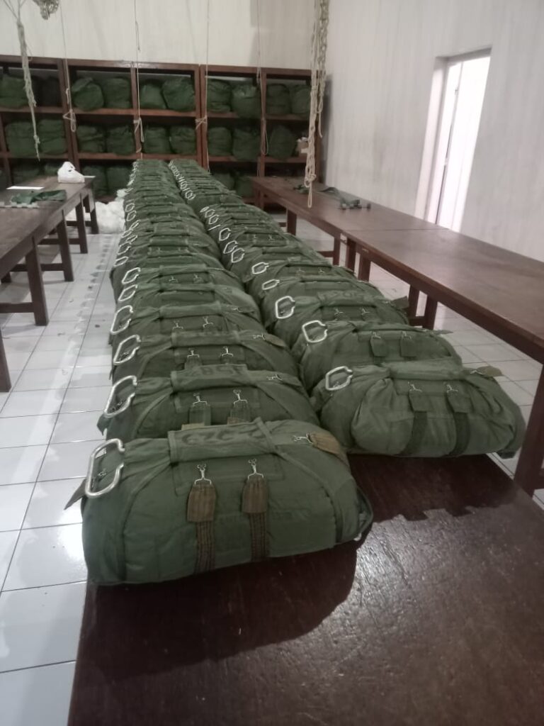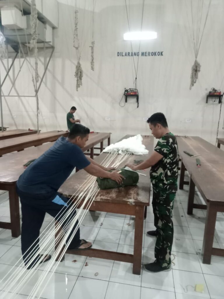 Seluruh payung utama dan cadangan menjalani pemeriksaan ketat, meliputi pengecekan material, keutuhan tali, serta uji lipat dan paket sistem. Tim teknisi bekerja terstruktur mulai dari tahap pengemasan hingga finalisasi untuk memastikan setiap perangkat siap digunakan.