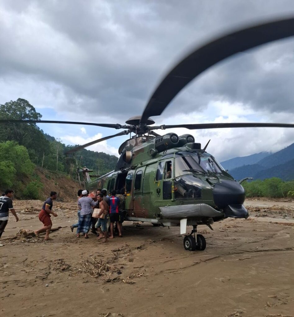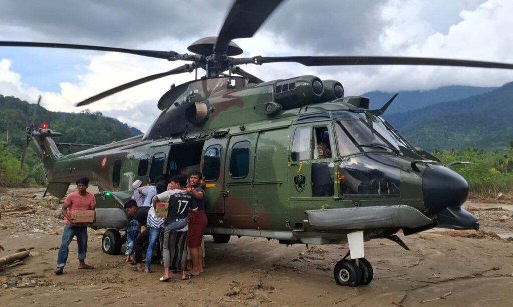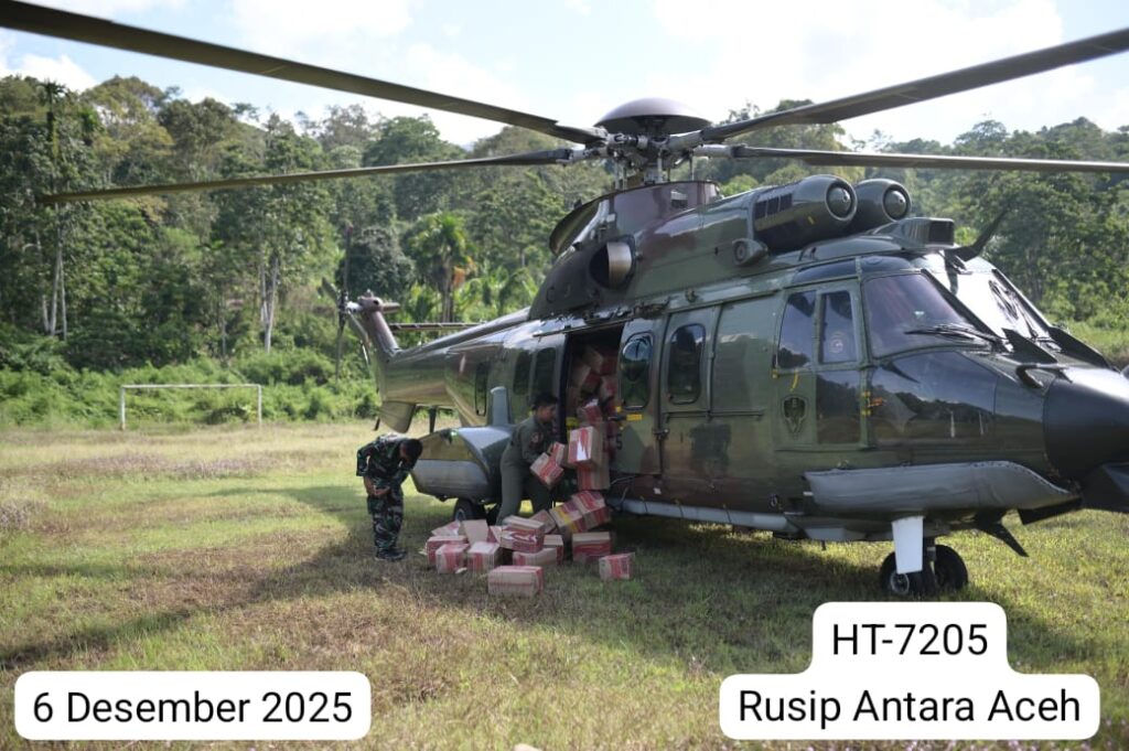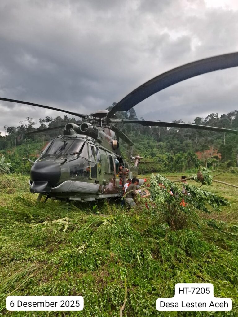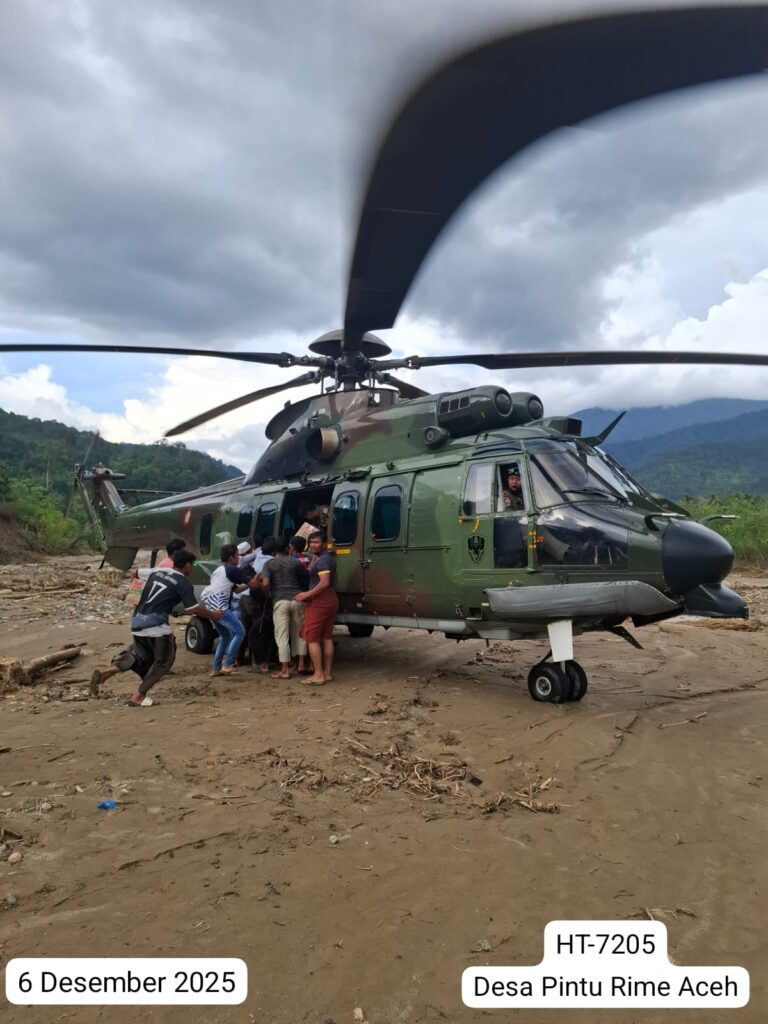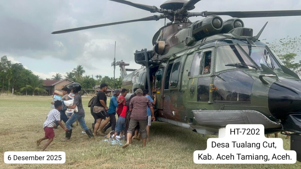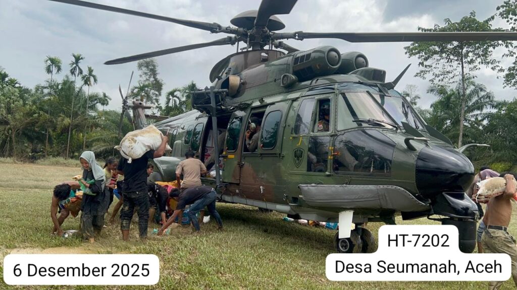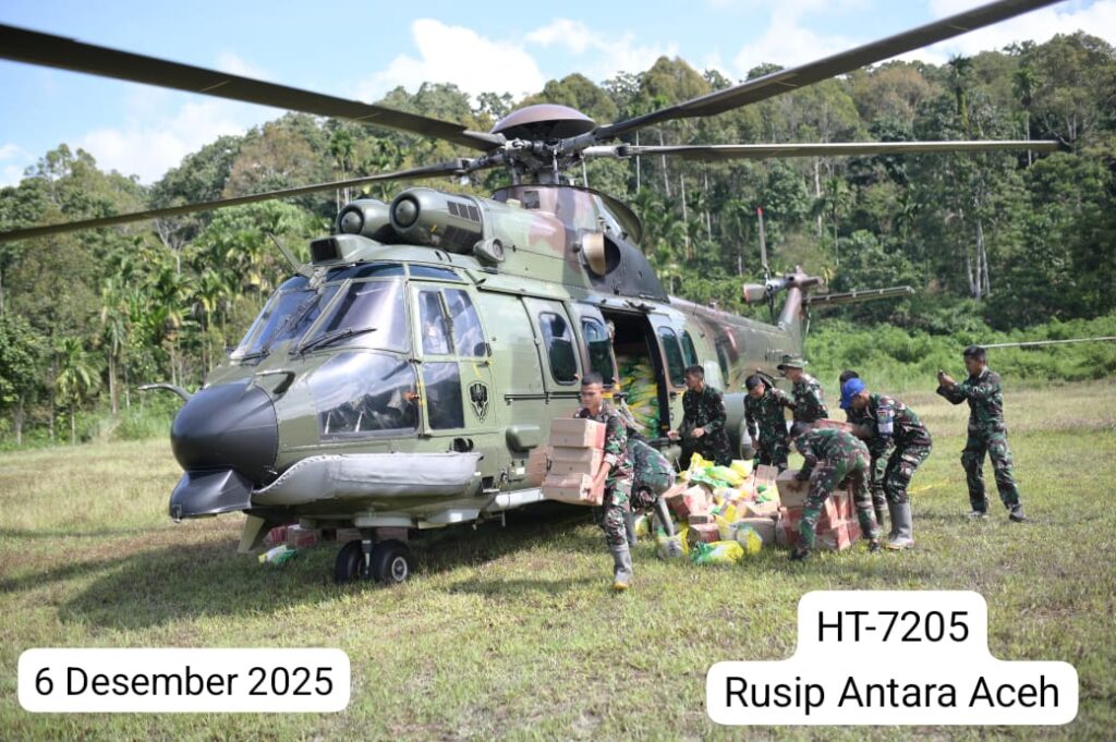 ACEH, Cakra101.com – TNI Angkatan Udara kembali mengerahkan dua helikopter EC-725/H225M Caracal untuk mendukung percepatan penanggulangan bencana dengan menyalurkan bantuan logistik ke sejumlah lokasi yang masih terkendala akses darat di wilayah Aceh, Sabtu (6/12/2025).