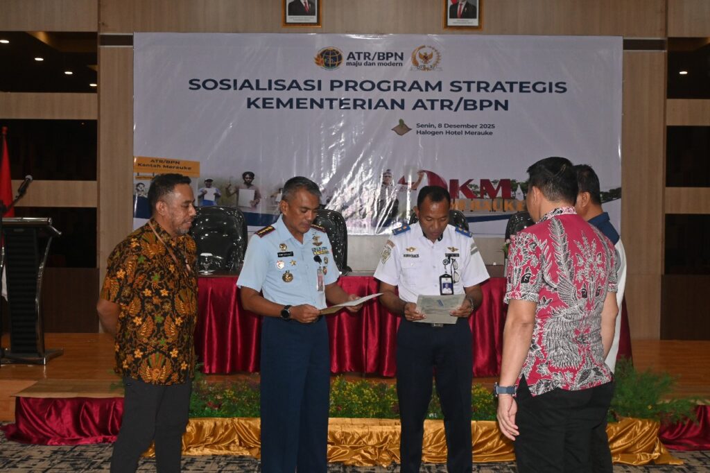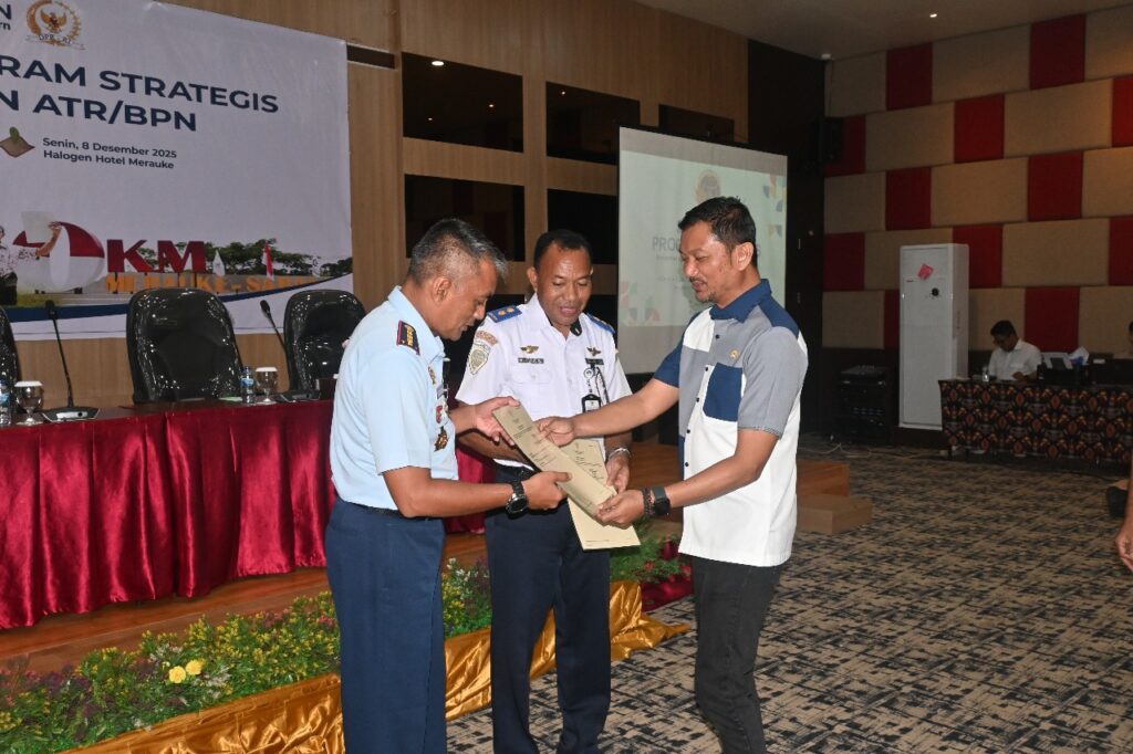 Sertifikat diserahkan Anggota Komisi II DPR RI, Indrajaya, S.E., didampingi Kepala Kantor Pertanahan Kabupaten Merauke, Pantoan K.P.H. Tambunan, S.ST., kepada Komandan Lanud J.A. Dimara, Kolonel Pnb Beny Aprianto, S.M., di Hotel Halogen, Merauke, Papua Selatan, Senin (8/12/2025).