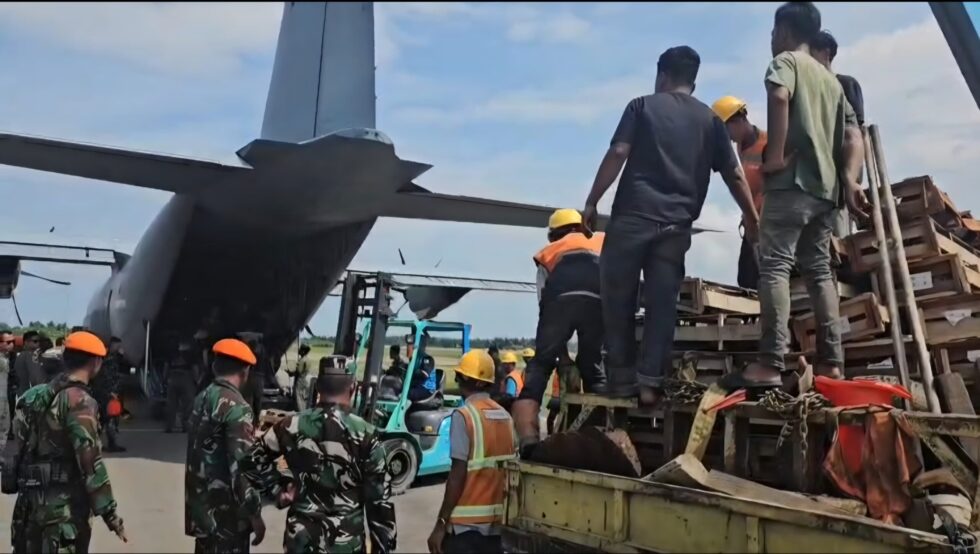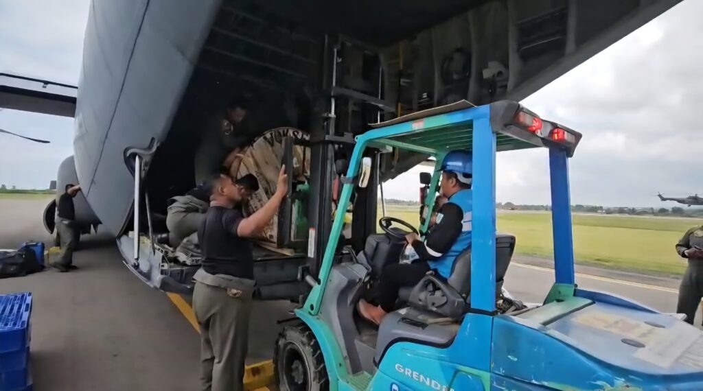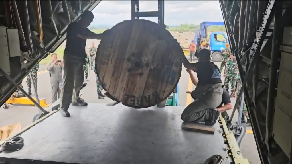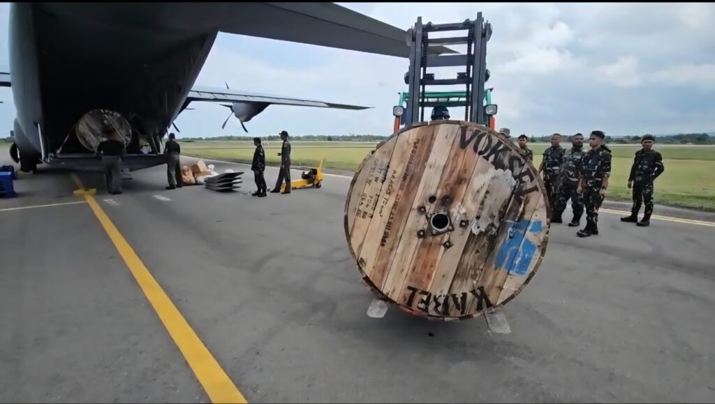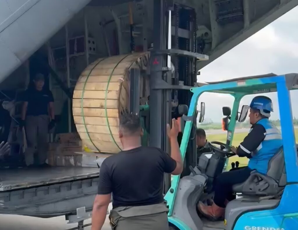 LHOKSEUMAWE, Cakra101.com – TNI Angkatan Udara kembali mendukung upaya pemulihan infrastruktur vital di wilayah Aceh. Pesawat angkut C-130J Super Hercules bernomor A-1340 melaksanakan misi pengangkutan peralatan kelistrikan milik PLN, di Bandara Malikussaleh, Lhokseumawe, Jumat (12/12/2025).