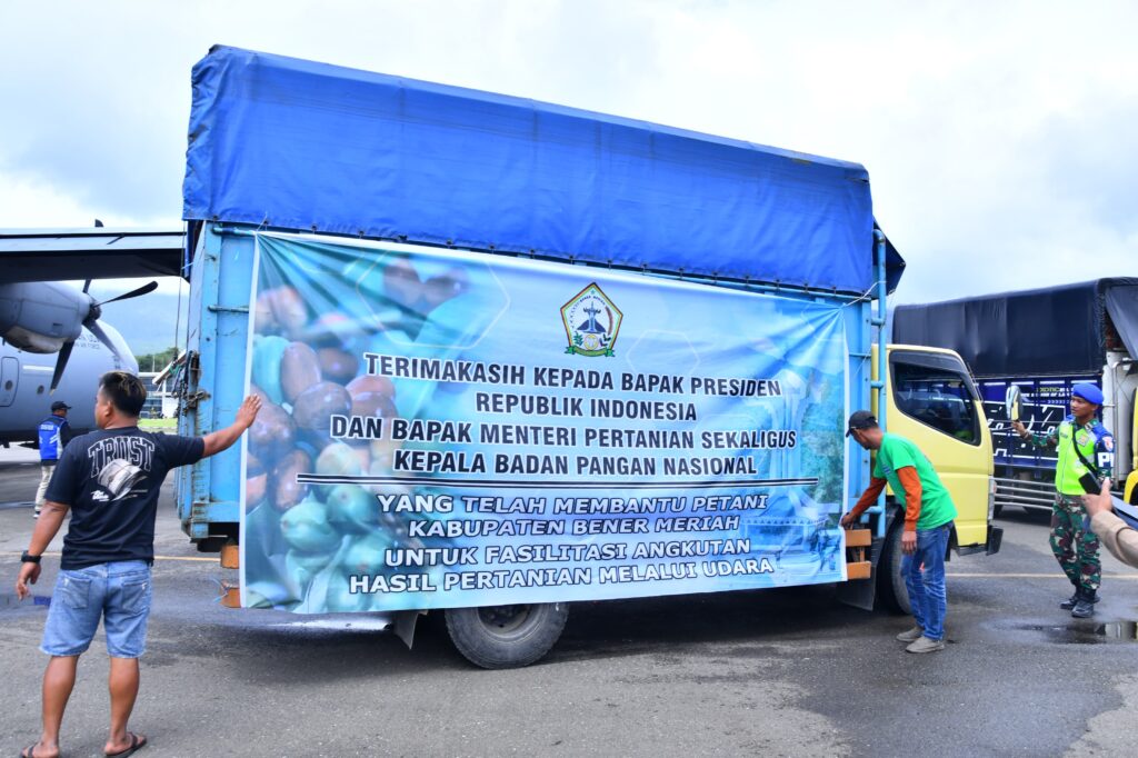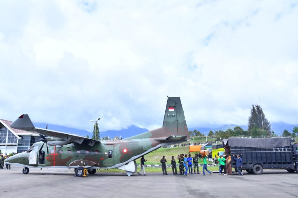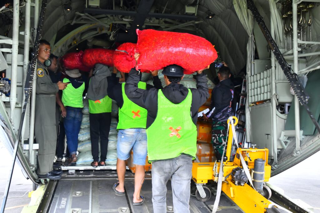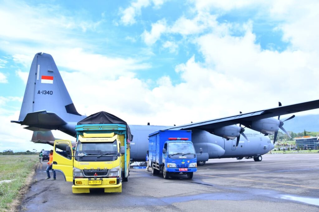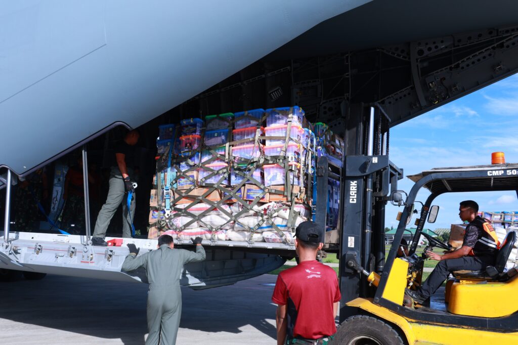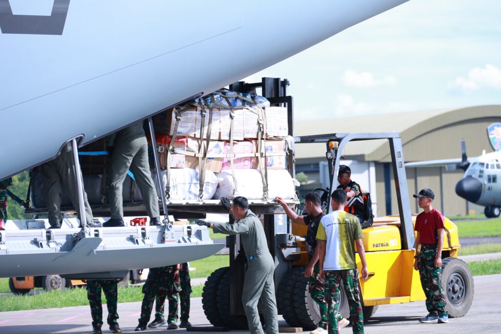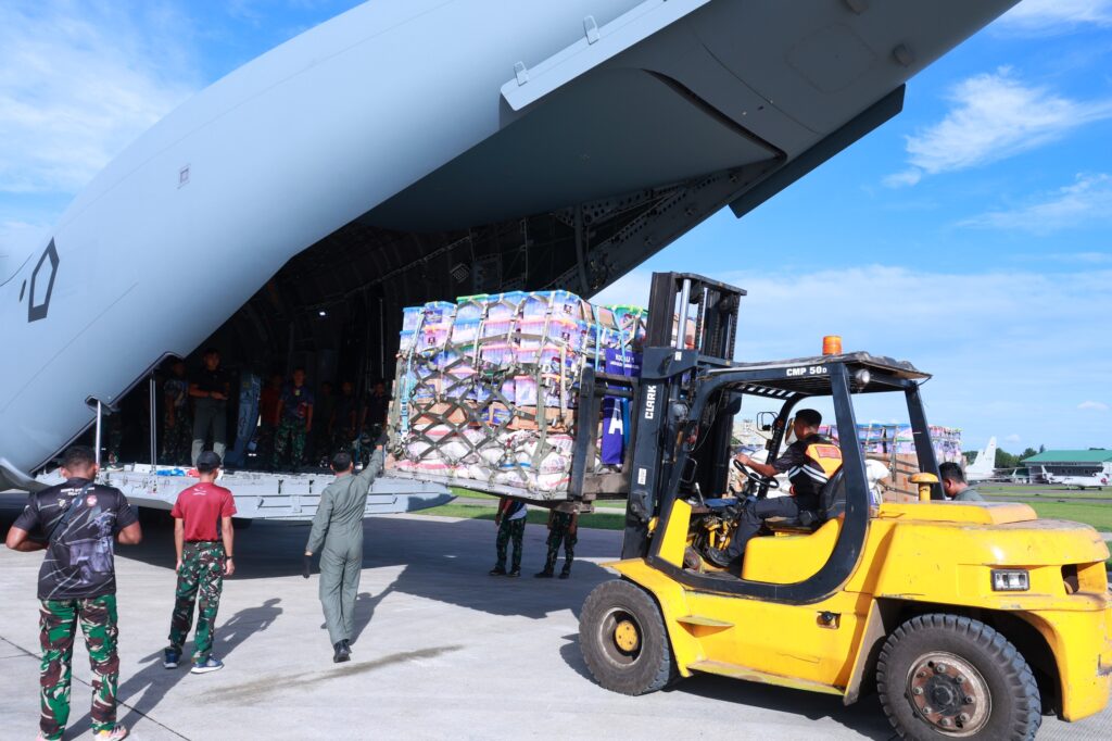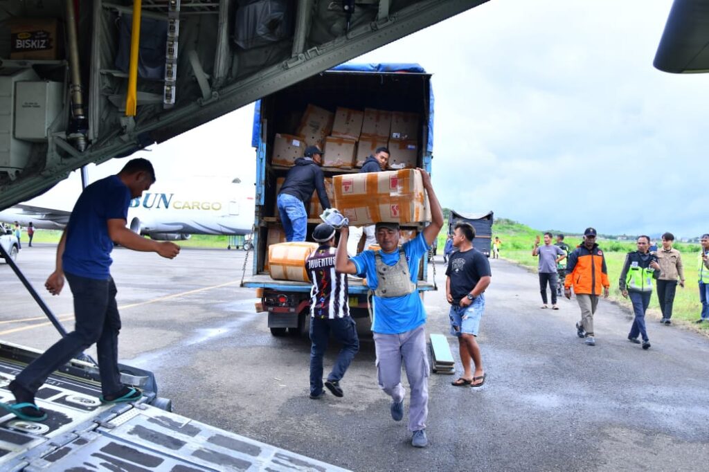 Pesawat dengan nomor registrasi A-4001 tersebut mengangkut bantuan seberat 19.589 kg dengan muatan bahan pangan serta kebutuhan dasar masyarakat.