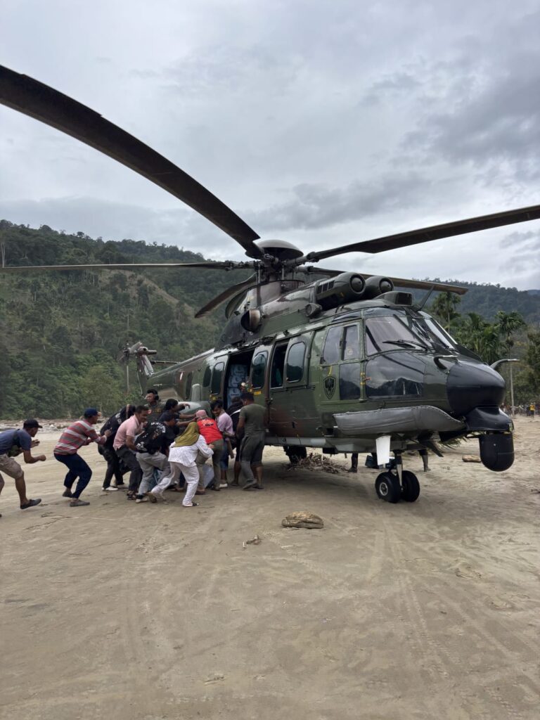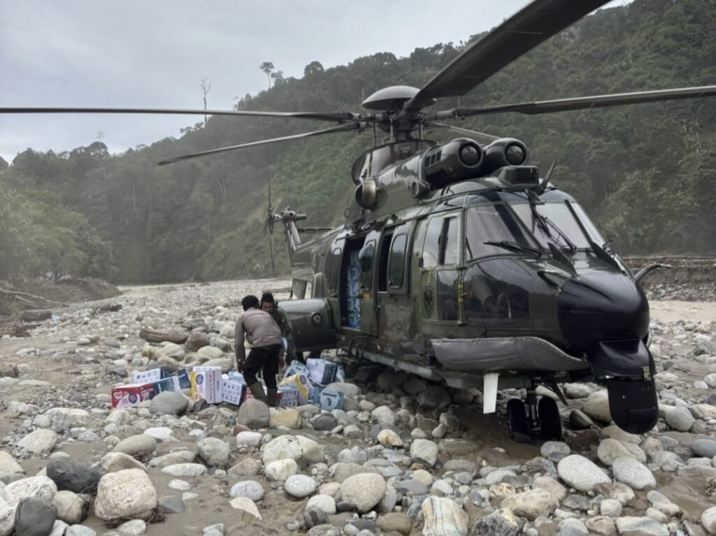 Helikopter yang diberangkatkan dari Lanud Soewondo, Medan, tersebut membawa bantuan kebutuhan dasar dengan total muatan 1.800 kilogram. Logistik disalurkan ke Desa Simpur Jaya sebanyak 900 kilogram dan Desa Rumah Bundar sebanyak 900 kilogram, dua desa terdampak yang akses daratnya sulit untuk dijangkau pascabencana.