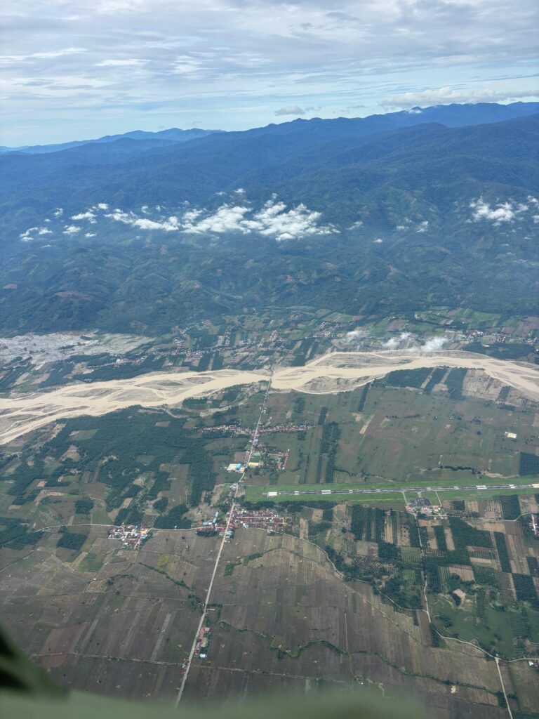 Pendaratan di aliran sungai dipilih sebagai titik distribusi karena keterbatasan medan dan kondisi infrastruktur yang tidak memungkinkan penggunaan jalur darat. Lokasi tersebut menjadi satu-satunya area yang dapat dijangkau helikopter untuk memastikan bantuan sampai kepada warga.