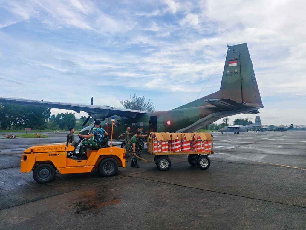 Bantuan diberangkatkan dari Lanud Soewondo, Medan, menggunakan dua pesawat TNI AU. Pesawat CN-295 nomor registrasi A-2907 mengangkut 90 helibox seberat 450 kilogram, sementara pesawat Cassa NC-212 nomor registrasi A-2114 membawa 100 helibox dengan berat total 500 kilogram.
